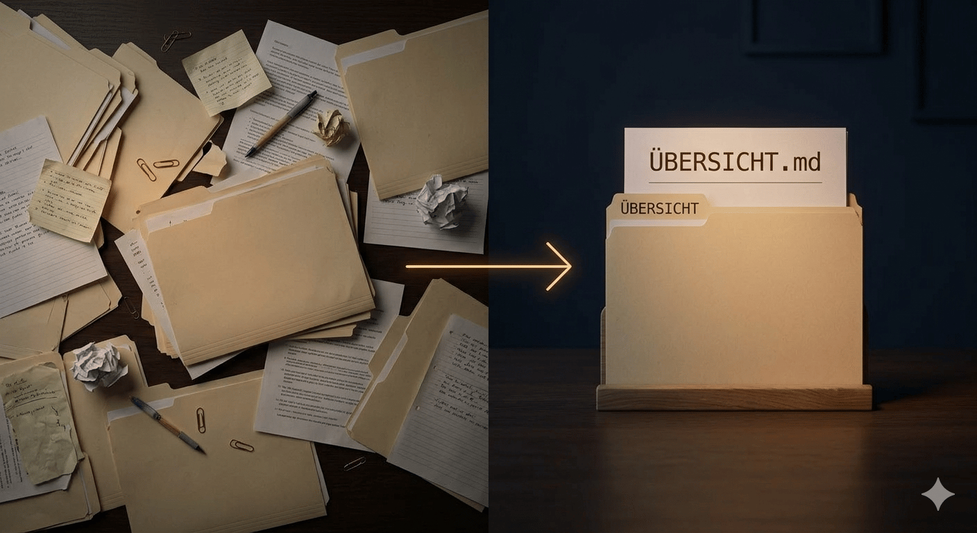 Es waren 23 Markdown-Dateien in verschiedenen Ordnern — Notizen, Entwürfe, Client-Briefings. Ich wollte eine Übersicht: Was ist aktuell? Was ist veraltet? Was fehlt?