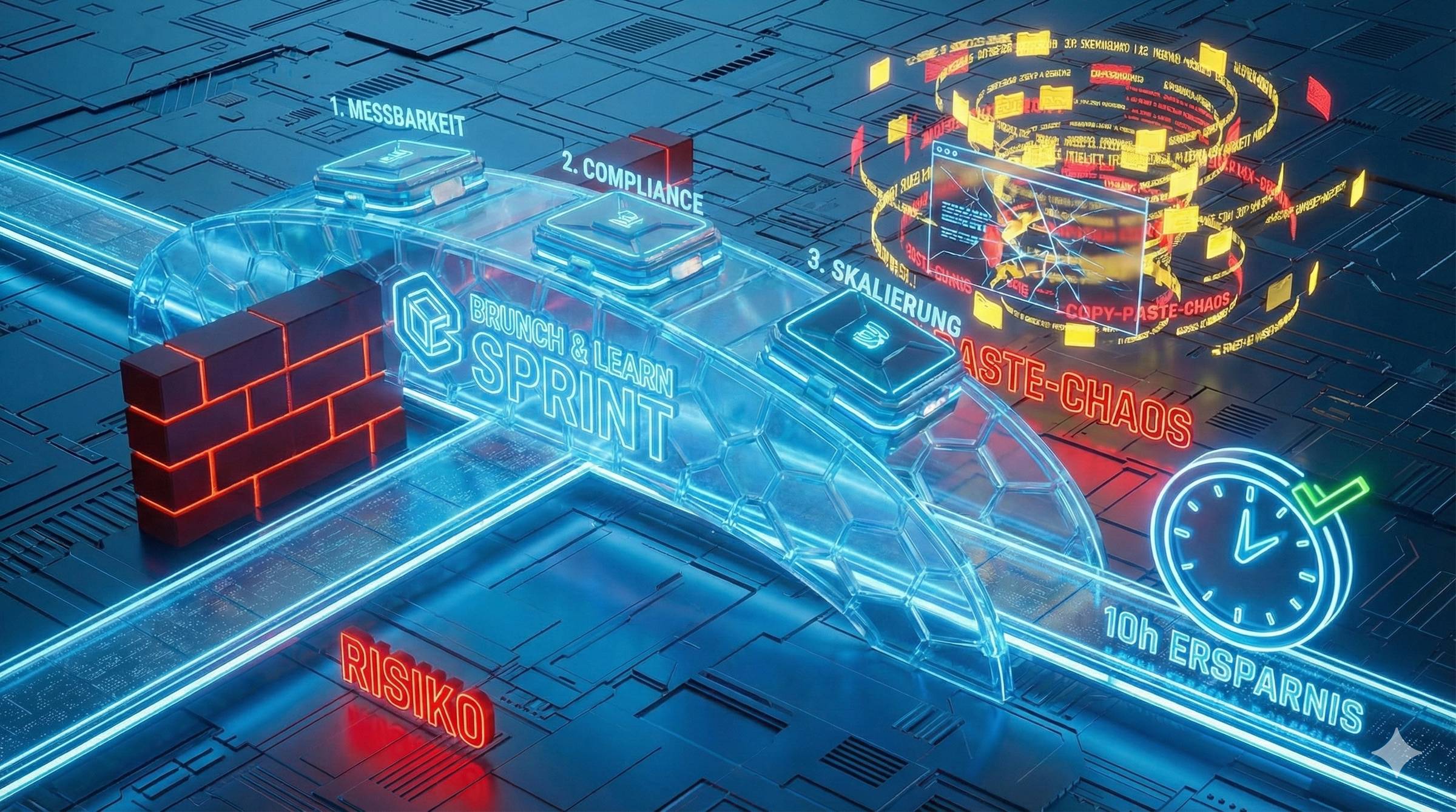 - Rechts: Der Chaos-Overhead (Ineffizienz): Wo KI genutzt wird, führt die fehlende Systematik zum Copy-Paste-Loop. Die Zeit, die Du sparen sollst, wird in Wartung und Fehlerbehebung verbrannt.